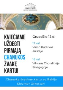 Дорогие друзья, приглашаем вас на зажжение первой Ханукальной свечи! 12 декабря, в 17.00, на столичной площади им. В. Кудирки, а в 18.00 – в Вильнюсской Хоральной синагоге!