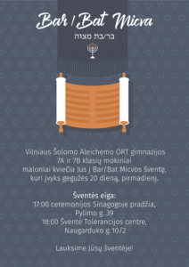 Приглашаем на праздник Бар/Бат-Мицвы ребят и девочек из Вильнюсской гимназии ОРТ им. Шолом-Алейхема 20 мая, в понедельник, в 17.00 в Вильнюсской Хоральной синагоге, а в 18.00 в Центре Толератности Государственного еврейского музея им. Виленского Гаона.