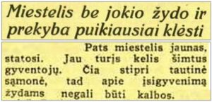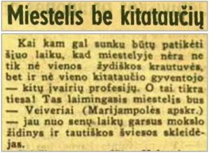 Текст:  В наше время кое-кому будет трудно поверить, что в городке нет ни только ни одного еврейского магазинчика, но и ни одного жителя-инородца другой профессии. А это – сущая правда. Этим городком-счастливчиком является Вейверяй (Мариямпольский уезд): уже со старых времен он известен как источник науки и распространитель национального просвещения
