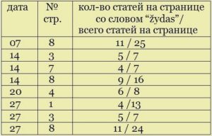 Обрати внимание, читатель, что слово обожала не взято нами в кавычки. Редакция действительно обожала евреев. Иначе, чем объяснить столь частое (практически на каждой странице!) употребление слова “žydas”?  Знание арифметики позволило нам дать не только словесную, но также и количественную оценку степени этого обожания. Вот несколько наиболее ярких примеров в выпусках января 1939-го: