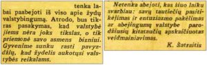 «… приходится очень посомневаться, поддерживают ли евреи государственность вообще. Кажется, будет правильным утверждение, что государство для них не цель, а лишь средство для личного бизнеса. В жизни трудно найти примеры, когда еврейчик [лит: žydelis] принес себя в жертву государственным делам [курсив К. Шатрайтиса]».
