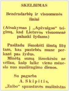 Почти не сомневаемся, что столь «страстная любовь» к евреям наборщика каунасской типографии “Žaibas” (открыта в 1930 году)  А.Скипитиса должна была проявиться уже в первые часы войны. Вполне возможно, что в LCVA (Lietuvos centrinis valstybės archyvas / Центральный государственный архив Литвы) имеются документы о его «подвигах». Обязательно поищем. А поиск начнем со «стены мучеников» в центре Вильнюса.