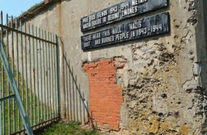 Sign with Battle-Scarred Wall – Ninth Fort – Nazi Genocide Site – Kaunas – Lithuania