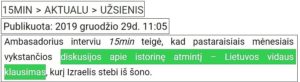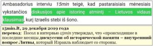 Перевод:  Посол в интервью 15min утверждал, что происходящие в последние месяцы дискуссии об исторической памяти – внутренний вопрос Литвы, который Израиль наблюдает со стороны.