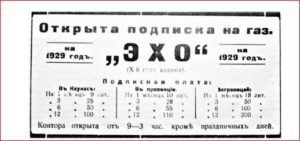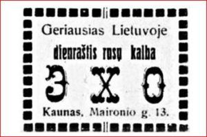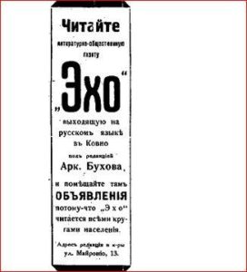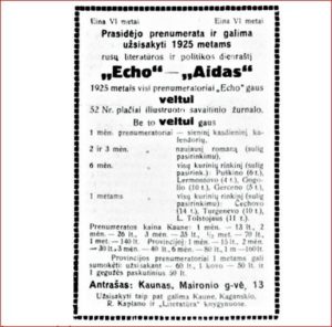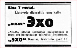 Реклама в журнале „Aitvaras“ уведомляла, что выходящую в Литве седьмой год газету «Эхо» широко читают занимающиеся торговлей, поэтому она самая удобная для размещения объявлений.