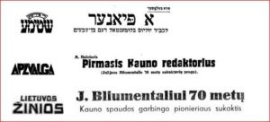 И коллеги из газет «Ди идише штиме» [на идише: идишский голос], „Lietuvos žinios“ [летувос жинёс, лит. яз.: вести Литвы] „Lietuvos aidas“ [летувос айдас, лит. яз.: эхо Литвы], „Apžvalga“ [апжвалга, лит. яз.: обзор] рассказали читателям о вкладе Ю. Блюменталя в становление прессы в Литве (На этом пути случалось и такое: в 1927 г. за публикацию интервью с министром охраны края «Эхо» оштрафовали на 1000 Lt).