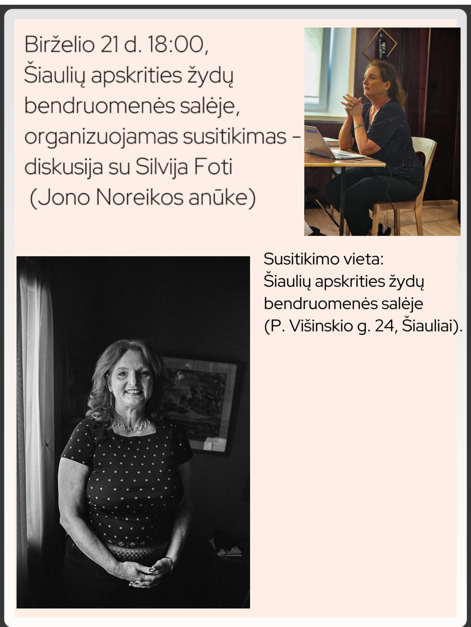 21 июня, в пятницу, в зале еврейской общины Шяуляйского уезда (Шяуляй, ул. Вишинскио, 24) состоится встреча и дискуссия с американской журналисткой, писательницей Сильвией Фоти, внучкой скандально известного литовского офицера межвоенного периода Йонаса Норейки. Начало в 18.00.